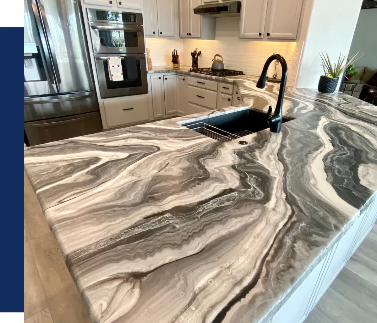 Beautiful, durable, custom-designed epoxy countertops that transform kitchens, bathrooms, bars, outdoor areas, and more. Create the look of marble, granite, quartz, or artistic metallic finishes at a fraction of the cost of replacement.