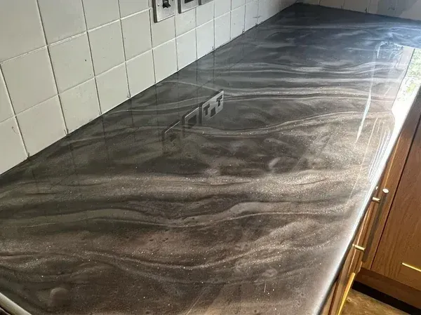 Epoxy countertops offer a seamless, high-gloss surface that mimics natural stone, solid surface, or completely unique artistic finishes. Perfect for upgrading old, worn, or outdated countertops without the cost and mess of replacement.